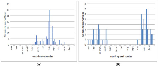 Photinus signaticollis—phenology. (A): Europe (2016–2020 observations); (B): Argentina and Uruguay (2014–2020 observations); 70 records from www.inaturalist.org; www.ecoregistros.org; www.fotosaves.com.ar (accessed 20 October 2020).