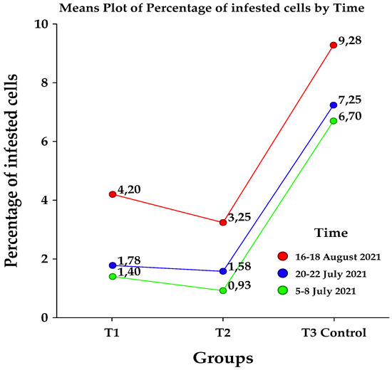 Following application of the Tukey–Kramer multiple-comparison test, the results (Table 5) show highly significant differences between the percentage of infested cells of each treated group (T1 and T2) as compared with T3, the control group, as calculated values (6.7; 7.25; 9.2) in the control group are greater than the critical value (5.78) at α = 0.001.