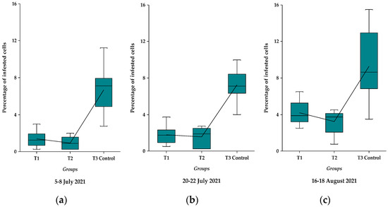 The box plotted data on the percentage of varroa mite infested cells evaluated in different experimental groups (T1, T2) as compared with T3 control in different time intervals: (a) 5–8 July 2021; (b) 20–22 July 2021; (c) 16–18 August 2021. The lines between treatments unite the mean values of each treatment and the central horizontal lines represent the median values.