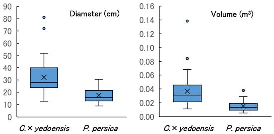 Diameter, length, and volume of sample logs. Cross marks indicate mean values. Sample sizes (n) were 86 (for C. × yedoensis) and 39 (for P. persica).