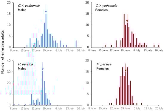 Emergence trends of A. bungii by sex and host species. Arrows indicate the date of 50% cumulative adult emergence.