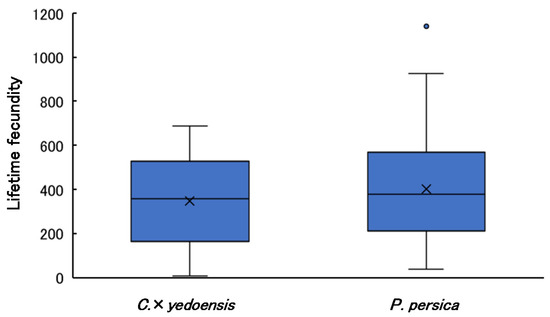Lifetime fecundity of A. bungii females by host species. Cross marks indicate mean values. Sample sizes (n) were 41 for C. × yedoensis and 32 for P. persica.