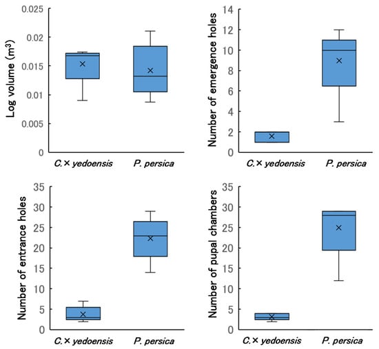 Volume of sample logs and numbers of emergence holes, entrance holes, and pupal chambers observed during log dissection. Cross marks indicate mean values. Sample size (n) was 5 for each tree species.