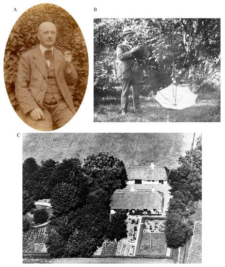 (A) Lavrids Jørgensen (1865–1937), photographed in 1915 by Peter Esben-Petersen. (B) Lavrids Jørgensen in the field surveying for insects, with a sweep net and umbrella (both images are kindly reproduced with permission from the archive of Entomology, Natural History Museum of Denmark, University of Copenhagen). (C) Strandby Skole (Strandby School) (54.668° N, 11.586° E) in an early image with a thatched roof. Notice the diversity of what are presumably vegetables and the diversity of microhabitats in the garden (image kindly reproduced with permission by Anders Thaarup and Christa Varming).