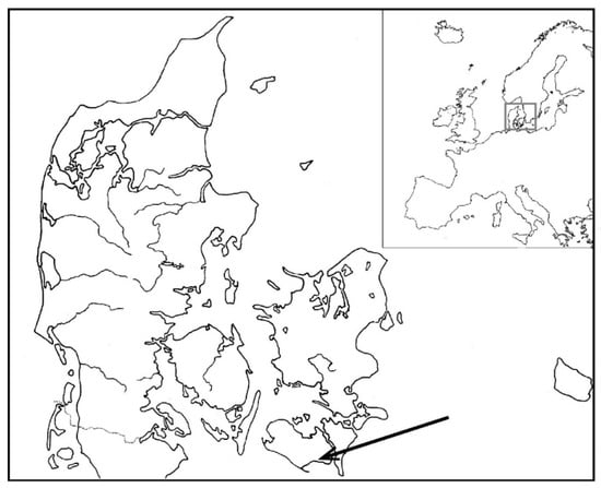 Lolland is the fourth largest island (1242 km2) in Denmark, surrounded by the Langelandsbelt, the Fehmarnbelt, the Baltic Sea, Guldborg Sund, and the Småland waters (Figure 2). The Guldborgsund municipality, where the school, Strandby Skole, near Sandager is located (54.668° N, 11.586° E), has an average temperature of 18.1 °C during the warmest month of the year in July (average 2006–2015), with a climate buffered by the close proximity to the sea preventing extreme temperatures year-round. The yearly average temperature in Guldborgsund is higher (9.3 °C) than the country average (8.9 °C), and rainfall is reduced because of the flat terrain that limits cloud formation [39]; thus, the physical settings favor the presence and persistence of warm-dependent insect species such as bees. At the same time, the entire south-facing coastline of Lolland is only narrowly separated from Germany by the Baltic Sea, making the island a known colonization point for southern climate migrants expanding northward [40]. Historical climate data from Denmark shows a higher corrected annual average temperatures for the period 2000–2019 compared to 1900–1919 [41]. In the recent 2000–2019 period, 19 out of 20 years are above the average temperature relative to a 1981–2010 baseline, while the early period from 1900–1919 had 18 out of 20 years below [41]. Annual accumulated precipitation was lower in 18 of 20 years in the 1900–1919 period compared to higher in 13 of 20 years in the 2000–2019 period [41]. In 1872, a disastrous flood struck large areas of Lolland, and in the following years, the areas west of Strandby were secured by effective dikes protecting inland areas but also extending the coastline and draining wetland areas [42]. However, the local area that Jørgensen later sampled probably remained largely unaltered at the time.