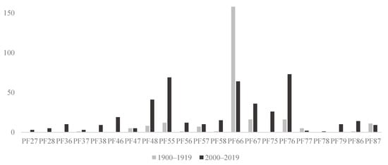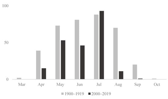 In total, 203 species (Table 2 and Supplemental Table S1) were reported in the two periods covering 1900–1919 and 2000–2019, but less than half, 92 species, occurred in both sampling periods. Jørgensen and his contemporaries recorded 174 species of bees from Lolland in the period from 1900–1919 (see Supplemental Table S1 legend for notes about certain of the species). Our recent efforts discovered 121 species of bees from Lolland, including 29 species not reported in 1900–1919 (see also [52]). At the same time, 82 species reported in 1900–1919 were not re-discovered in 2000–2019 (Table 2). The majority of the 1128 specimens from Lolland 1900–1919 were collected by Jørgensen himself. Only Andrena nigroaenea and Anthophora plumipes are represented by >30 specimens collected by Jørgensen, while 71 species are represented by merely one or two individuals. In the recent period (2000–2019), we recorded 1409 specimens of bees, with the majority collected during 2017 and 2019. It is evident that Jørgensen and contemporaries mostly collected around the UTM-10 square PF66 (where his home in Strandby is located), whereas in recent collections, both PF66 as well as bordering squares, have been visited (Figure 3). Being a resident entomologist on Lolland, Jørgensen had the advantage—besides strong local knowledge of collecting localities—of extending the active collecting period to the extremes of the season (Figure 4). In particular, Jørgensen was able to sample during the spring and the fall, whereas the recent collections from visiting entomologists were timed to coincide with peak adult bee activity periods, May to July, missing out the early spring (April) and fall (August–September) (Figure 4).