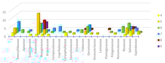 Pollen from the following plant families was recorded from individual bees collected during April (4) to September (9) in the early period from 1900–1919.