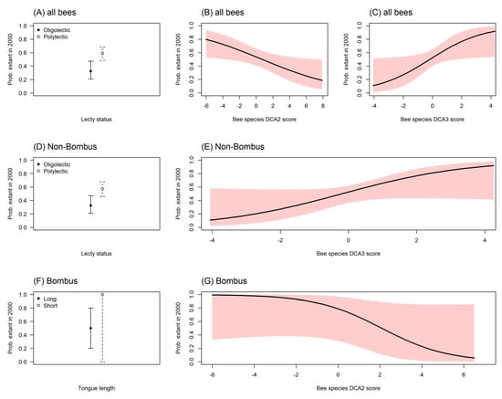 Probability for non-parasitic species recorded in the 1900–1919 period to be extant in the 2000–2019 period. (A) Based on lecty (feeding), oligolectic species were less likely to be extant (p < 0.01). (B) Probability for bee species being extant decreased with DCA2 floral preference scores (Supplemental Figure S1 and Table S2) (p < 0.05). (C) Probability for bee species being extant increased with DCA3 floral preference scores (Supplemental Figure S1 and Table S2) (p < 0.05). (D) Based on lecty, oligolectic species were less likely to be extant when Bombus species were excluded (p < 0.01). (E) For Non-Bombus species, floral preferences (DCA3 scores) influenced the probability of being extant (Supplemental Figure S1 and Table S2). Bombus species were excluded (p < 0.05). (F) Based on tongue length [74]. Higher probability for short-tongued Bombus species than for long-tongued Bombus species (p < 0.05). (G) Probability for Bombus species being extant decreased significantly, with species DCA2 scores (Supplemental Figure S1 and Table S2) (p < 0.05), but the effect size was not statistically significant (z-value = −1.6, p = 0.11). Parasitic solitary and Cuckoo bumblebees (Bombus (Psithyrus)) were excluded from all analyses excluded. Tables including p-values are provided in Supplemental Table S2.