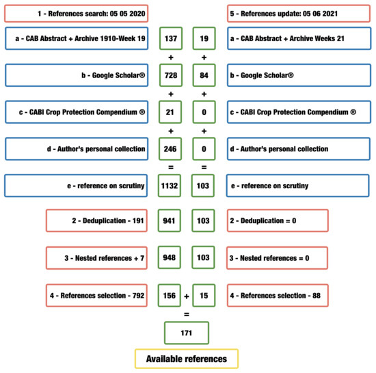 We retrieved LAB references from several repositories, using the systematic review method (Figure 1). The bibliography was consulted in two steps using an exact string, namely “Zelus renardii”. The first step is an initial search on databases for the 1856–2020 interval; the second step is to search for bibliographic updates published in 2021, one year later, in the same databases. Databases selected were CAB-Abstract via Ovid, Crop Protection Compendium® (CPC) and Google Scholar. The period from 1856 to 2021 was analysed.