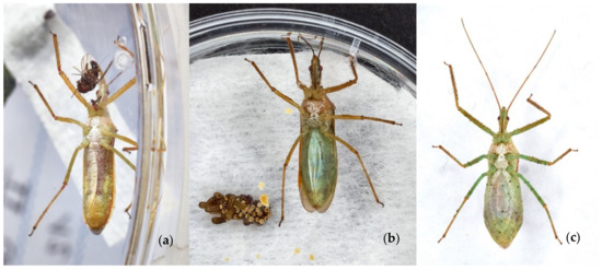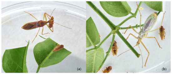 LAB lays eggs in batches, each with 12 to 62 units [58]. Each female can lay up to 270 eggs [138] in 2–3 sets during its life [43,112], with a fertility rate ranging from 18 to 64% [43]. The eggs are sub-cylindrical, brown [58,71,122,138,172] and topped by a whitish operculum [58]. Moreover, LAB covers egg masses with a sticky secretion [58,138]. Usually, the reduviid places the egg batches on the upper side of leaves or various substrates. Post-embryonic development consists of five juvenile instars [58,138]. Adults exhibit sexual dimorphism, with bigger females (♀♀ are about 14 mm long and ♂♂ ca. 11 mm) [58,176].