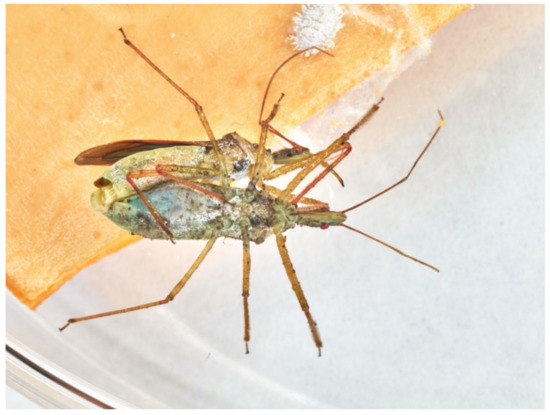 - Stoner, A.; Metcalfe, A.M.; Weeks, R.E. Plant feeding by Reduviidae, a predaceous family (Hemiptera). J. Kans. Entomol. Soc. 1975, 48, 185–188. [Google Scholar]