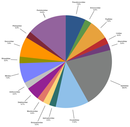The literature of LAB prey preferences showed that LAB uses 88 prey species belonging to nine orders. References show ca. 48.9% of the total prey species belong to Hemiptera. Other taxa references—Blattodea and Orthoptera 1.1%, Thysanoptera 4.6%, Neuroptera 5.7%, Lepidoptera 15.9%, Coleoptera 12.5%, Diptera 4.6% and Hymenoptera 5.7%, respectively. The analysis of Hemiptera species references in Figure 6 shows a wide array of prey, with a 20.9% maximum score for Aphididae.