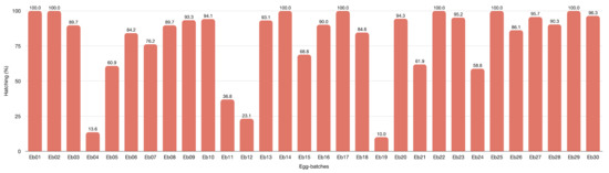 Mbata [112] and Barrera [43] suggest that each LAB female laid 2–3 batches giving an average of 33 eggs with a prolificacy ranging from 18 to 64% [43]. In our rearing, females laid a total of 1112 eggs; females laid an average of three batches averaging 27 eggs (Table S2) [58,138] with a prolificacy of about 80%, with a higher hatching rate (Figure 7) and many new-borns than reported. Moreover, females are polyandrous, and El-Tom [58] considers repeated mating induces more eggs than single-mating. Embryonic development of our LAB lasts 17.4 ± 5.4 days, unlike Swezey [138] and El-Tom [58] that reported LAB embryonic development of about 6–10 days at 25 °C. Our hatching period data is the average value for one-year-long LAB breeding experiments. Swezey [138] and El-Tom [58] report a shorter May–August breeding period. Differences in hatching time may rise from photoperiod, food available or female age. There is a concordance between our breeding data and observations of one-century-long literature.