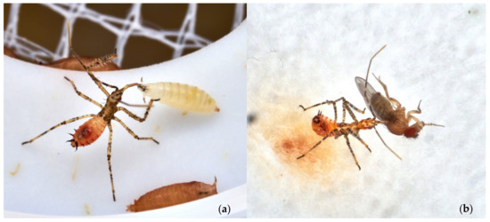 LAB is considered a generalist predator [12,13,14,15,16,17]. However, even generalist predators show prey preferences that satisfy their developmental and reproductive needs [18]. The range of prey depends on physiological, physical, and behavioural limitations [19]. Accordingly, the prey list of LABs in the field usually has fewer species than those reported in the literature, as for other generalist predators [18,19,20,21].