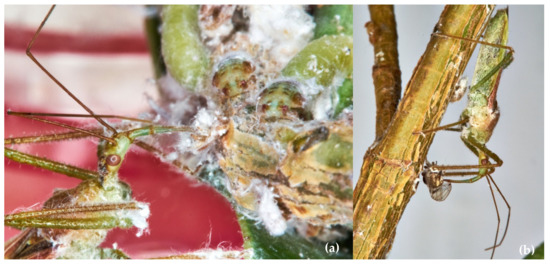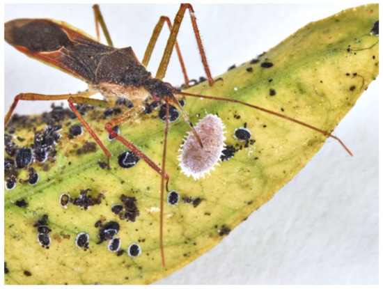 The hemipteran’s honeydew could lure LAB to the plants infested with available prey, causing LAB egg laying and the possible presence of their pre-imagoes. Multiple observations of Zelus preying on wandering among T. alacris, O. binotatus, A. spiniferus, S. coffeae or S. oleae suggest this honeydew luring effect. Fall surveys on the same plants listed in Table 3 did not result in LAB findings. Perhaps LAB adults had moved to overwinter shelters [181]. Further comparative observations on neighbouring clean plants support the hypothesis that LAB is associated with hemipteran honeydews or faeces.