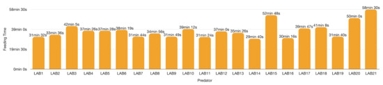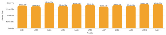 Eleven LAB adults preyed on 10–12 B. oleae during a one-day extended test, intermingled with a day of starvation. The container for the test was a vented parallelepiped polystyrene rearing flask (Table 2). The olive fly puparia were from an oil mill near Molfetta (41.205651° N; 16.573373° E). Adult olive flies escaped from puparia in plexiglass-vented boxes (Table 2) with a plenty food supply [30]. To avoid using teneral adults, the flies hardened in the boxes for a minimum of one day after the escaping and before the tests. We recorded LAB feeding time on each B. oleae as we did for the Xylella vectors tests.
