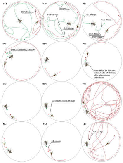 We investigated the ability of Z. renardii to prey on Apis mellifera L., 1758 (Hymenoptera: Apidae—AM). We placed both insects in Petri dishes (Table 2, 81 cm3) on shading support over a LED (4000 K°) ring lamp for 10 min to interact. We used 19 LAB individuals (9 ♀ and 10 ♂) and five mid-aged honeybee workers. Each AM replayed randomly ca. four times. Insect behaviour was recorded (.raw image or full HD movie format) with a digital camera (Olympus® Pen camera, OM Digital Solutions Corporation, Hamburg, Germany). If an interaction lasted more than 10 min, we continued to record until the interplay ended. Scrutinising the interactions resulted in a series of paths of both insects, drawn to follow the tracks taken by LABs and AMs. Path drawings were processed using Adobe Illustrator® (Adobe Inc., San Jose, CA, USA).