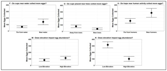 The educators implemented a student-driven mosquito surveillance program with their students in both years of the study. Each educator worked with their students to design an experiment with testable hypotheses, and all educators returned their material both years. Mosquito data for both years are provided in an Open Access database (https://megabitess-tga.hub.arcgis.com/) (accessed 29 December 2021), so educators, the community, and the public can all access and learn about the dataset. We visualized data from a subset of classroom-driven inquiries to provide an example of how students and educators used the mosquito surveillance project to test their own hypotheses (Figure 2).