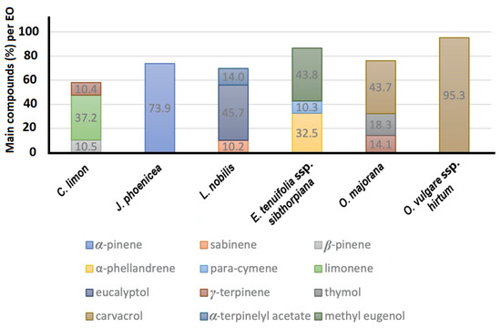 The composition of O. majorana EO is compatible with previous reports that indicate both thymol [67] and carvacrol [68] as main compounds and its significant chemical diversity is recognized. It must be noted that previous analyses of O. majorana EO from Greece [69] have also revealed the molecule of cymene as a major compound but not γ-terpinene. The L. nobilis EO composition is also consistent with previous reports identifying eucalyptol as the main compound [70], while the major compound α-terpinenyl acetate has also been reported [71]. The composition of E. tenuifolia ssp. sibthorpiana, O. vulgare, C. limon and J. phoenicea EOs has been presented and extensively discussed in previous studies [60,72,73].