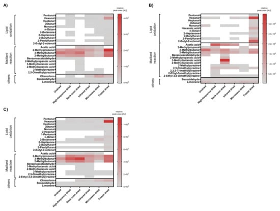 A total of 30 volatile compounds were identified from mealworm larvae samples using three different headspace GC-MS based techniques. These included 12 aldehydes, 2 ketones, 5 acids, 1 alcohol, 5 pyrazines, 2 furans, 2 alkanes and 1 terpene. Most of these are compounds occurring in above-average amounts in heat-treated foods and are formed during the Maillard reaction or as secondary and tertiary lipid oxidation products (Figure 1 and Supplementary Tables S1–S3). The Strecker degradation products of the branched-chain amino acids valin (2-methylpropanal), leucin (3-methylbutanal) and isoleucin (2-methylbutanal), although slightly variant depending on the HS-GC methods, were already present in high amounts in the undried larvae. These aldehyde values remained high in the freeze-dried samples. Rack oven-, dielectric- (high-frequency, microwave) and infrared-dried larvae showed comparatively lower mean peak area values for these substances. The headspace GC-MS profiles of the larvae rack oven-dried at 60 °C are rich in Strecker degradation products such as 2-methylpropanoic acid, 2-/3-methylbutanoic acid and alkylpyrazines, indicating the progress in Maillard reactions during this drying procedure. Alkylprazines were also detected in the dielectric heated larvae samples in addition to lipid oxidation markers. The heat maps of freeze-dried samples are dominated by volatile compounds formed in the course of lipid oxidation.