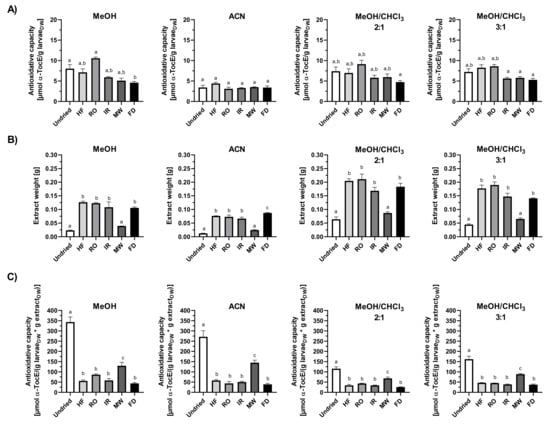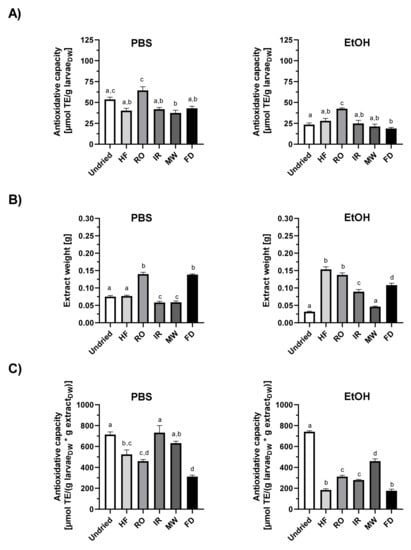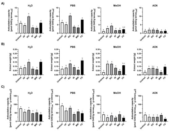 The drying method of the larvae proved to be relevant for the extraction efficiency outcome (Figure 2B, Figure 3, Figure 4B), which is of importance in terms of quantity and diversity of antioxidants in the polar and nonpolar extracts. Thus, for the aqueous solvents (H2O and PBS) extraction did work best for rack oven dried and freeze-dried larvae (Figure 2B and Figure 3B). When calculating the antioxidative capacity relative to the larvae material input, RO aqueous extracts scored the highest in TEAC and FCR (Figure 2A and Figure 3A). However, if the factor extract dry weight was included into the calculation of the antioxidant capacity, the values of the fresh as well as the HF-, IR- and MW-dried larvae aqueous extracts adjusted to those of the RO larvae (Figure 2C and Figure 3C). This indicates higher antioxidant quantities and/or potency in the crude, HF-, IR- and MW-dried larvae extracts compared to the RO samples. The freeze-dried larvae were the most favourable matrix in extraction yields for almost all of the solvents used. However, those extracts performed the worst in their relative antioxidant capacities in all tests (Figure 2C, Figure 3, Figure 4C).