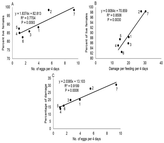The correlation between mean number of eggs laid with percent of live females (A), damage with percent of live females (B) and damage with mean number of eggs produced by these mites in 4 days (C), on different hosts plants. The plots in the figure represent different plant species: (1) Moringa oleifera, (2) Phaseolus vulgaris, (3) Capsicum annuum var. glabriusculum, (4) Thevetia ahouai, (5) Pittosporum tobira, (6) Helietta parvifolia, and (7) Carica papaya.