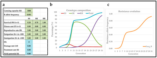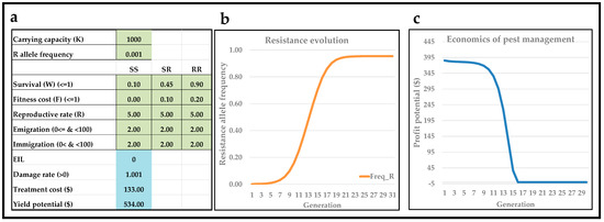 Figure 1a shows the user interface, in which coefficients are introduced into cells in light green (resistance evolution) and light blue (basic economics of insecticide-based pest management) and with separate columns for each of the three genotypes. Based on input coefficients, three graphs illustrate the model outputs during 30 discrete and univoltine generations: (1) percentage of pest individuals for each of the three genotypes and total pest population as a percentage of the carrying capacity (Figure 1b), and (2) resistance allele frequency (Figure 1c).