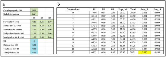 Figure 2a shows input the coefficients of a scenario, and Figure 2b shows the predicted resistance allele frequency (Freq_R) reaching 0.05 after 12 generations. This scenario was generated based on (1) an assumption of no/negligible refuges (so very low immigration rates and equivalent to 2% of the carrying capacity, because it was assumed that refuges were small and/or rare), (2) knowledge about the initial frequency of allele(s) conferring resistance (0.001), (3) the assumption that resistance is recessive (WSS = 0.16, WSR = 0.16, and WRR = 0.80), (4) the existence of fitness costs associated with resistance and with the fitness cost being additive (FSS = 0, FSR = 0.13, and FRR = 0.26), and (5) the assumption that resistance is incomplete (so WRR < 1.00). Thus, what appears to be a reasonable scenario was found to align with field observations from India (the cell highlighted in yellow in Figure 2b). Furthermore, increasing the immigration rates of all three genotypes to 15% (which has the same effect as including a 15% refuge), the interactive tool predicted that a resistance allele frequency remains below 1% for 16 generations (Figure 3b). Moreover, the only difference between the scenario presented in Figure 2 and Figure 3 is the immigration rate (2% of the carrying capacity in Figure 2 and 15% in Figure 3). Thus, the interactive tool illustrates and corroborates the important recommendation of farmers growing a non-Bt refuge, as refuges lead to a marked delay in insect pest resistance evolution to Bt-transgenic crops. In many Bt-cropping systems, recommended non-Bt refuges make up 20%, which, compared with the model output shown in Figure 3, would further delay resistance evolution to Bt-transgenic crops.