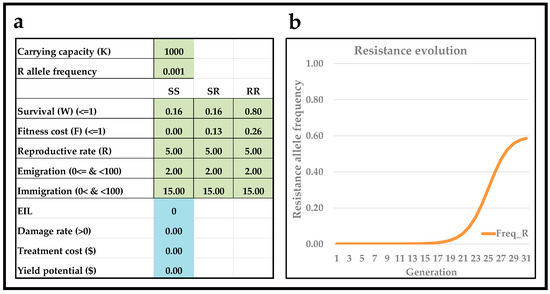 Population modeling is a cornerstone in applied entomology, and the first deterministic genetic population models of resistance evolution to insecticides were published 50 years ago [7,8,9], with the basic deterministic modelling framework remaining important today. In particular, many such modelling studies describe the evolutionary risk of resistance to genetically modified crops expressing insecticidal toxins, such as Bt (Bacillus thuringiensis) [13,35,36,38,44,45,46,47,48,49,50,51]. In addition to the large body of deterministic genetic population models of resistance evolution to Bt, there is a considerable number of studies describing resistance evolution to non-Bt insecticides [14,44,52,53,54,55,56,57]. Population modeling is a topic and skill set that requires both basic mathematical and biological knowledge, and it can only be taught effectively if both students and instructors have access to available programming platforms. The proposed interactive teaching tool could have been developed in R, C++, Python, Matlab, or other similar programming languages, but such versions would have required more advanced programming skills, software configurations (download and installation of specific libraries, etc.), and/or purchase of software licenses. Thus, although an Excel version may not be the most elegant solution (and does not readily enable features, such as running thousands of randomized simulations after adding stochasticity to coefficients), it was preferred due to the widespread availability and access to Excel via Microsoft Office.