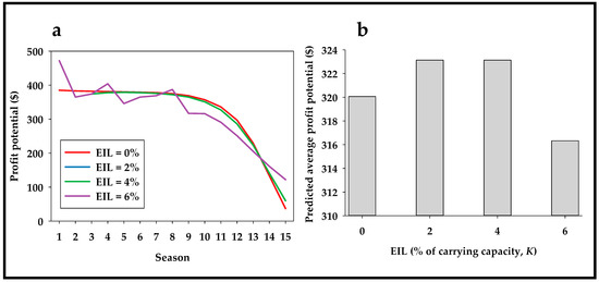 Predicted profit potential ($) as a function of EIL (economic injury level). Time series (a) and average (b) of profit potential for the first 15 discrete generations based on coefficients presented in Figure 4a but with different EIL (economic injury levels) ranging from 0–6% of carrying capacity (0–60 insect pest individuals as carrying capacity, K, equals 1000).