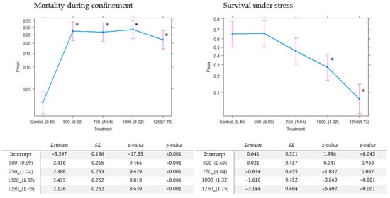Effect estimates and standard errors derived from the adjusted model of different densities of mosquitoes on two parameters: Probability of death during confinement (Pmort, left) and probability of survival under stress (Psurv, right). Four densities of mosquitoes (number of pupae loaded and resting density of vertical surface in mosquito/cm2 between parentheses) evaluated against the control container. Table: parameter estimation for the effects of different densities of mosquitoes on two parameters with mixed model logistic regression. Asterisks indicate statistical significance compared with the control (α-level 0.05).