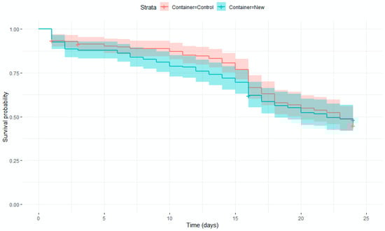 The Kaplan–Meyer plots for the different treatments are similar (Figure 3). The estimated average life was 18.7 days in the control (n = 197, SE = 0.5) and 17.6 days in the new design (n = 174, SE = 0.6). The hazard ratio for the new design was 0.995 as compared to the control, not significantly different from one (z = −0.03, p = 0.93). This suggests that no significant effect of container type was found.