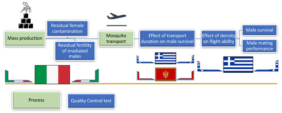 Flow diagram outlining of the processes from mass production to transport and the respective Quality Control (QC) tests performed. The flags of Italy, Greece and Montenegro indicate the activities conducted in respective states.