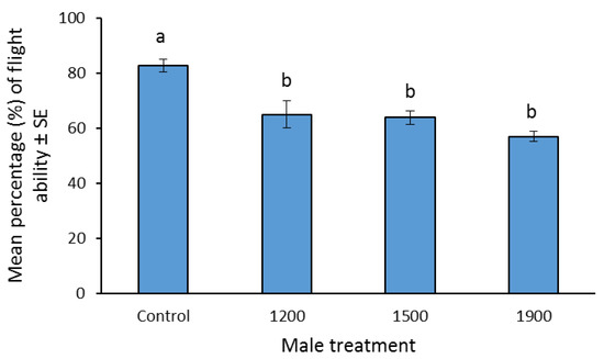 Flight ability tests were conducted using the aspirator device and the methodology described by Balestrino et al. [29]. Twenty males from each of the four density regimes and the laboratory control males were transferred to each suction tube. The aspiration time was set at 30 min, while 10 and 15 replicates were performed for sterilized and control males, respectively. This stress test can measure possible biological stress conditions and it was selected as an easy and rapid method compared to other methods [36].