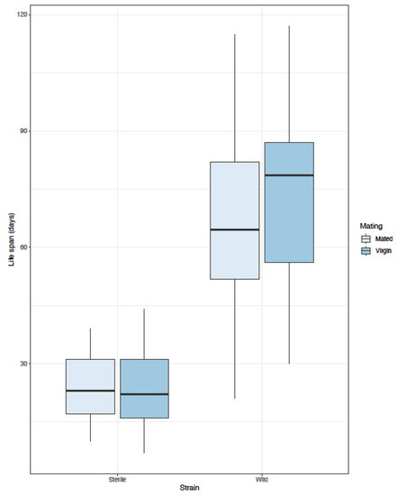 Box plots depicting the effect of male type (wild or sterilized) and mating status (mated or virgin) on longevity of males.