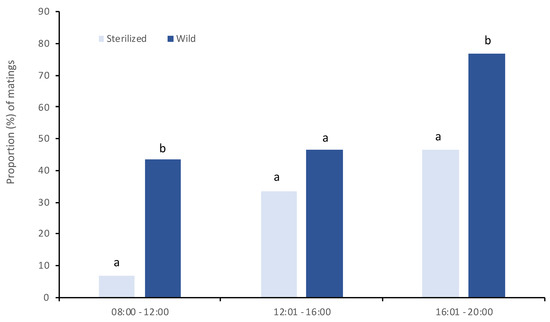 Daily patterns of mating for wild and sterilized males when wild virgin females were offered in a no choice experimental set up. Different letters indicate significant differences within each time interval (p < 0.05).
