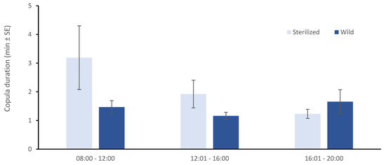 The duration of mating for both wild and sterilized males and for all three time periods is given in Figure 5. Despite a trend for longer mating duration during morning hours for the sterilized males, no differences were reported when all three time intervals were included in the analysis (t-test = 0.049, df = 178, p < 0.05).