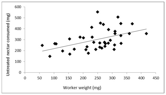 Correlation between the weight of B. terrestris workers fed with untreated artificial nectar and the amount of food consumed.