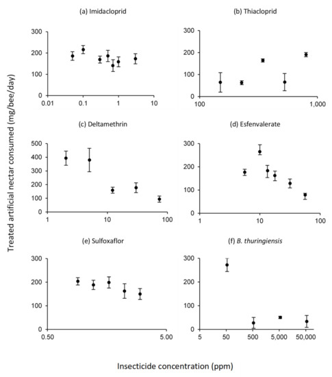 Average daily consumption per bee of artificial nectar treated with different concentrations of the insecticides imidacloprid (a), thiacloprid (b), deltamethrin (c), esfenvalerate (d), sulfoxaflor (e) and B. thuringiensis (f). Values expressed in mg of nectar consumed/bee/day. Average values of untreated nectar consumed daily by control bees in each bioassay are: 153.1 ± 20.3 (imidacloprid), 234.7 ± 44.3 (thiacloprid), 466.8 ± 31.5 (deltamethrin), 204.9 ± 13.9 (esfenvalerate), 177.6 ± 15.5 (sulfoxaflor) and 225.1 ± 17.3 (B. thuringiensis).