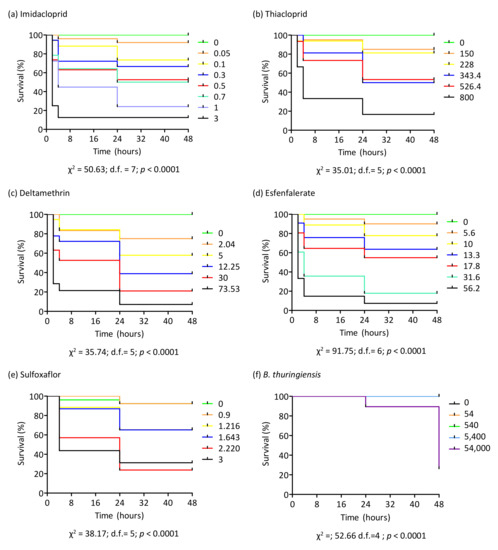 The Kaplan–Meier survival test was performed for the six insecticides tested. The probability of survival was below 20% by 24 h after starting treatment with the highest concentrations tested, except for sulfoxaflor and B. thuringiensis. In these two cases, the survival probability with all concentrations was higher than 20% at the end of the treatment (48 h) (Figure 3).