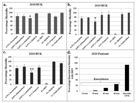 Results of WHO tubes bioassays with different public health insecticides. Results are average of percentage mortalities at 24 h post-exposure, with error bars denoting standard deviation. (a–c) indicate result from the BUK population in 2018, 2019 and 2020 respectively, while (d) indicates the results of 2020 Pantami population with 4 % DDT. * and ** = mortalities significantly different for ƛ-cyhalothrin when comparing 2018 vs. 2019 (p < 0.05) and 2018 vs. 2020 (p < 0.01).