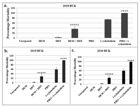 Investigation of the role of metabolic enzymes in insecticide resistance. (a–c). Effect of DEM and PBO synergists preexposure on susceptibility to DDT and ƛ-cyhalothrin, respectively, on BUK populations from 2018, 2019 and 2020. Results are average of percentage mortality for synergised and un-synergised females, with error bars indicating standard deviation. **** and ***** = significantly different at p < 0.0001 and p < 0.00001, respectively.