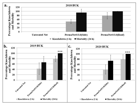 Results of WHO cone bioassays with side panels and roof of PermaNet® 3.0. (a–c) for 2018, 2019 and 2020, respectively. Results are percentage averages of 1 h knockdown or 24 h postexposure percentage mortalities, with error bars indicating standard deviation. (*** = p < 0.001 for 2019 and 2020, respectively).