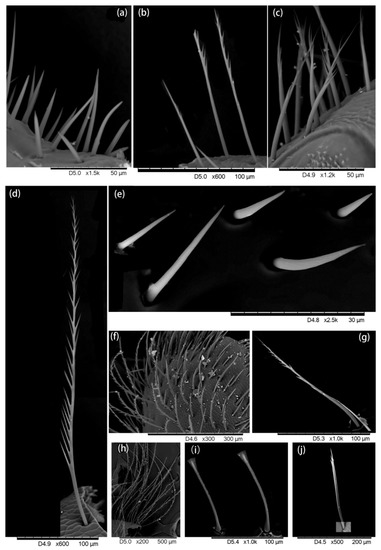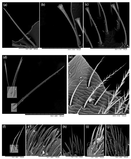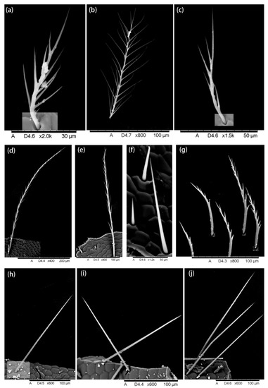 Hairiness structure on the leg. (a–e) Coxa, short and thin hairs without branches, (b,c) very few branches at the end of the hair, (d) long hair with short branches. (f–h) Trochanter, (f,g) three forms of hair, including (f,h) long hairs with short branches, (g) short hairs with short branches, and (f) short hairs without branches, were found. (i,j) Femur, two different forms are found: one end with a triangular structure (i) and other ends with very short branches (j).