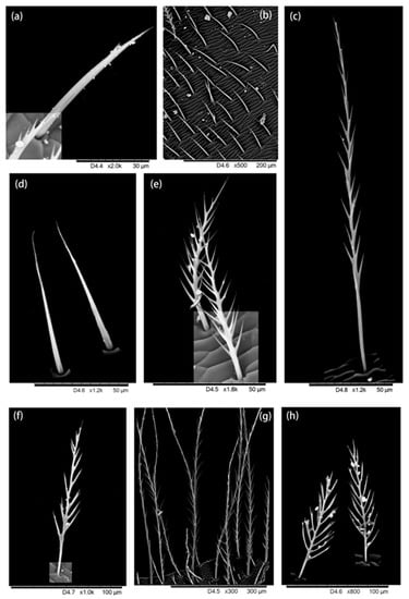 Hairiness structure on the thorax. (a–e) dorsal thorax: (a) hairs with very short branches, (b,d) short hair without branches, (c) long hairs with short branches, (e) short hairs with long branches. (f–h) Ventral thorax, two distinct forms of hairs were found on the ventral thorax: (f,h) short hairs with multiple branches, and (g) long hairs with short branches.