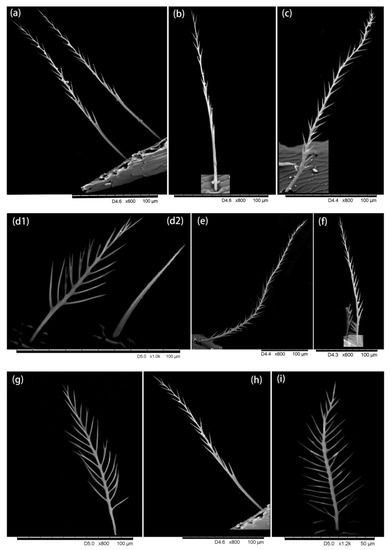 Hairiness structure on the abdomen. (a–e) Dorsal abdomen: (a–c,e) long hairs with short branches, (d1) short hair with multiple branches and (d2) short hair without branches. (f–i) Ventral abdomen, (f,h) long hair and short branches, and (g,i) short hairs with multiple branches.