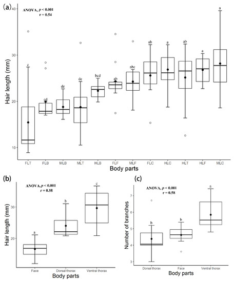 (a) The results of hair length and the number of branches on legs, where: FLT, foreleg thorax; FLB, foreleg basitarsus; MLB, mid-leg basitarsus; MLT, mid-leg tarsus; HLB, hind leg basitarsus; FLF, foreleg femur; MLF; mid-leg femur; FLC, foreleg coxa; HLC, hind leg coxa; HLT, hind leg trochanter; HLF, hind leg femur; MLC, mid-leg coxa. (b,c) Thorax and face. p-value shows the significant difference. Treatments with the same letter are not significantly different (one-way ANOVA and Pearson correlation coefficient (r)). Tukey’s test showed that the length across all parts was significantly different, while branches show that treatments with the same letter are not significantly different (p > 0.05).