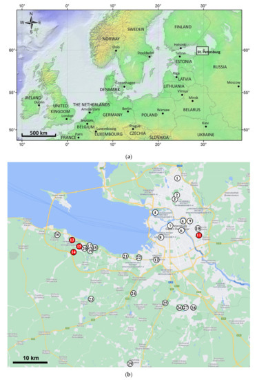 Location of the survey. (a) A schematic map of northern and eastern Europe with a rectangle outlining the survey area in Saint Petersburg; (b) Localities in the territory of Saint Petersburg at which the survey for the emerald ash borer has been conducted in 2020 and 2021. Location numbers are the same as in Table 1. Red circles indicate locations at which the beetle was detected, while white circles represent locations at which it was not detected. Location # 11 is situated in the Nevsky District, and locations # 13–15 are in the Petrodvortsovy District. Locations # 17–21 are situated in the territory of the Peterhof State Museum Reserve. A basic map used to create Figure 1b is based on an image from © Google, 2021.