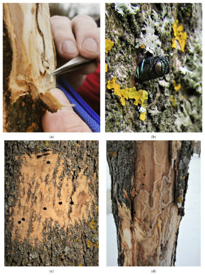 The emerald ash borer, Agrilus planipennis on ash trees in Saint Petersburg. (a) A larva being extracted from under the bark of Fraxinus pennsylvanica; (b) an adult emerging through an exit hole; (c) exit holes in the bark of F. pennsylvanica; (d) old galleries of the beetle on the dry-sided stem of F. pennsylvanica. Photo by D.L. Musolin (a), M.G. Volkovitsh (b,c) (Location # 13.1), and A.V. Selikhovkin (d) (Location # 14).