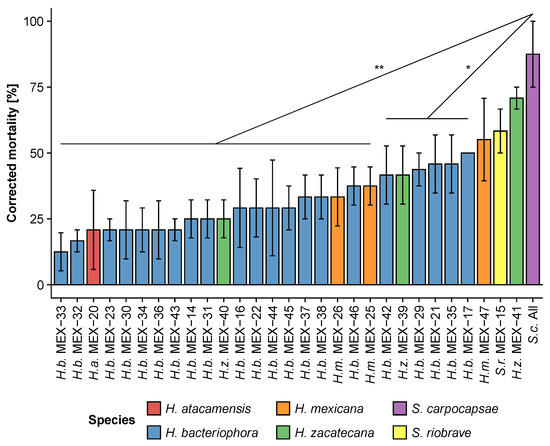 Virulence (mean ± SE) of Mexican entomopathogenic nematode strains (MEX) on third-instar Spodoptera frugiperda caterpillars in small arena laboratory bioassays. Mortality was evaluated seven days post inoculation with ten infective juvenile nematodes per caterpillar. The virulence of each Mexican strain was compared to the commercial Steinernema carpocapsae strain All (positive control). Stars (*) indicate significant differences obtained from many-to-one comparisons corrected for false discovery using the Benjamini and Hochberg method (no star: non-significant, *: p < 0.05, **: p < 0.01).